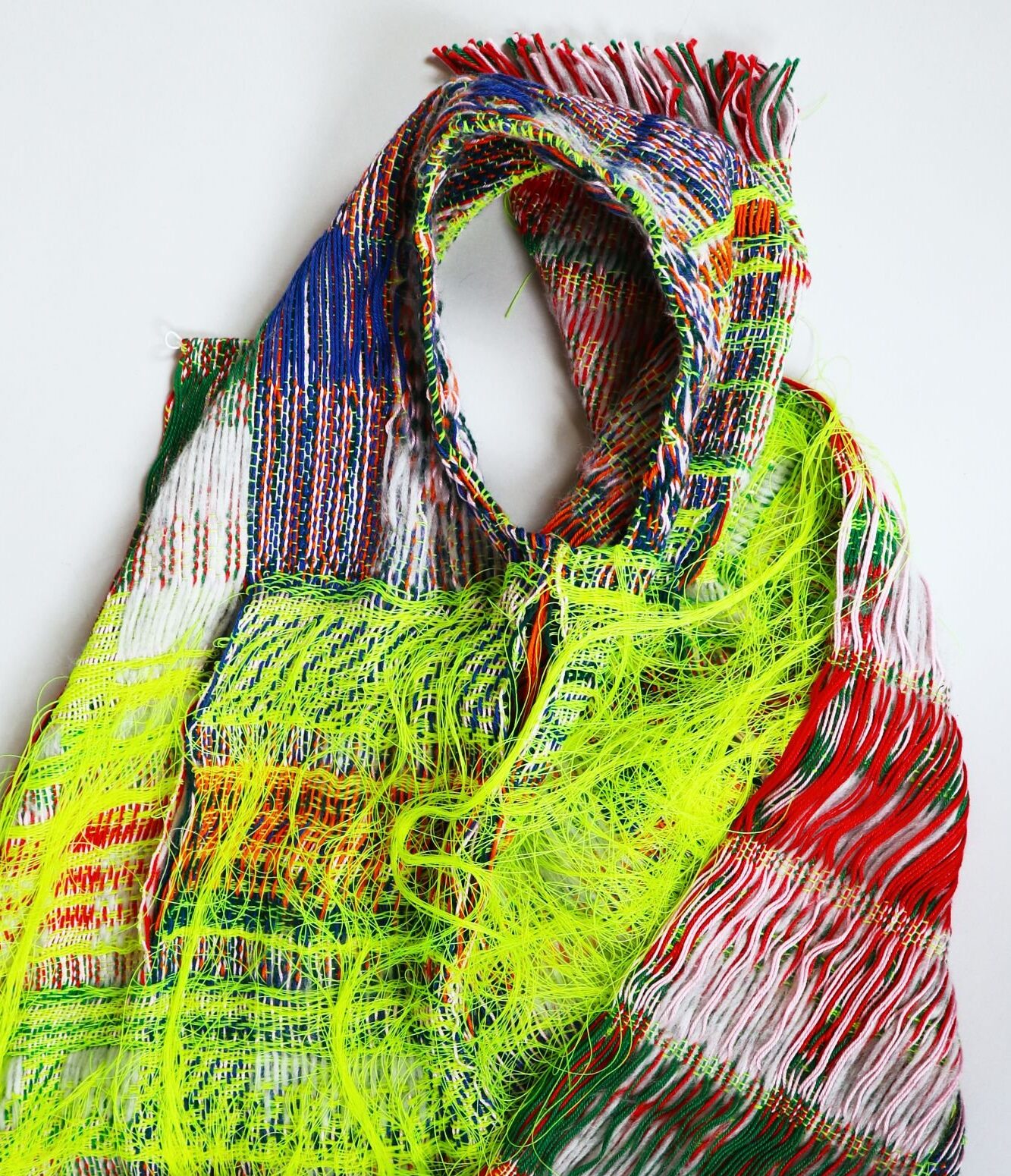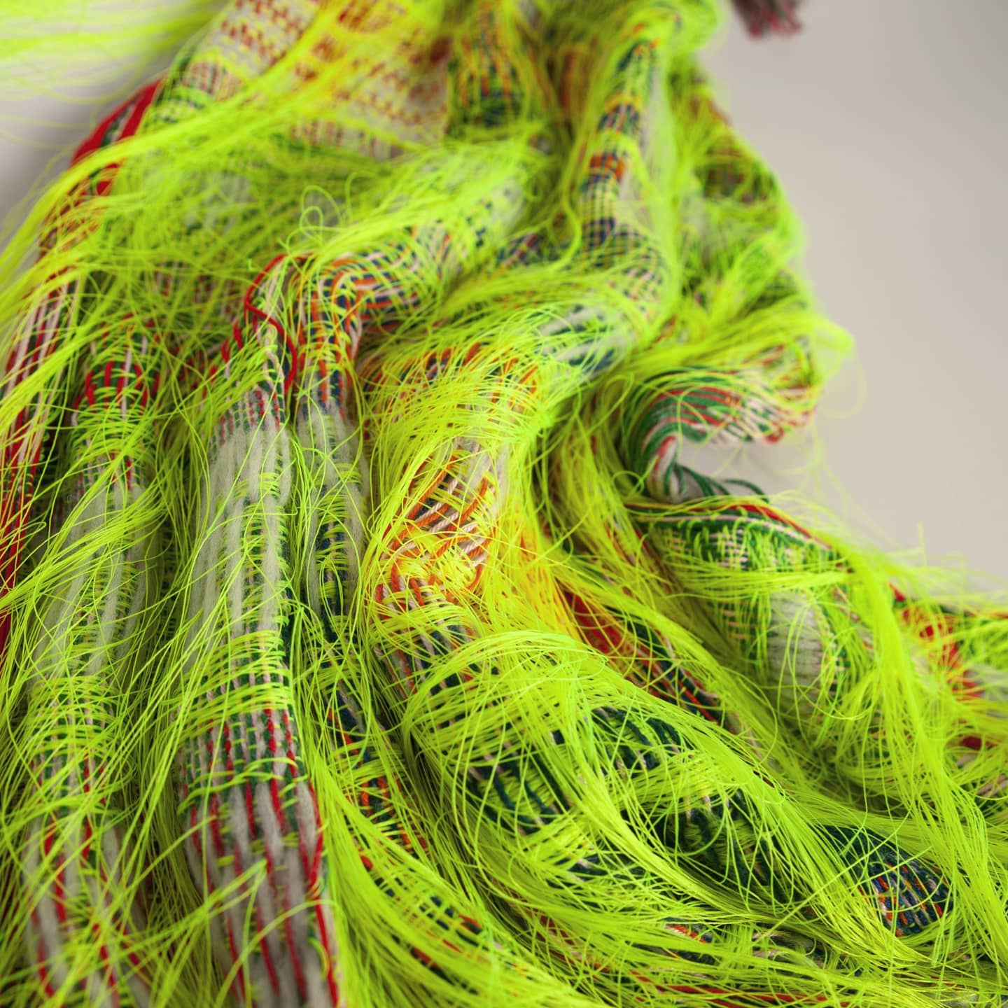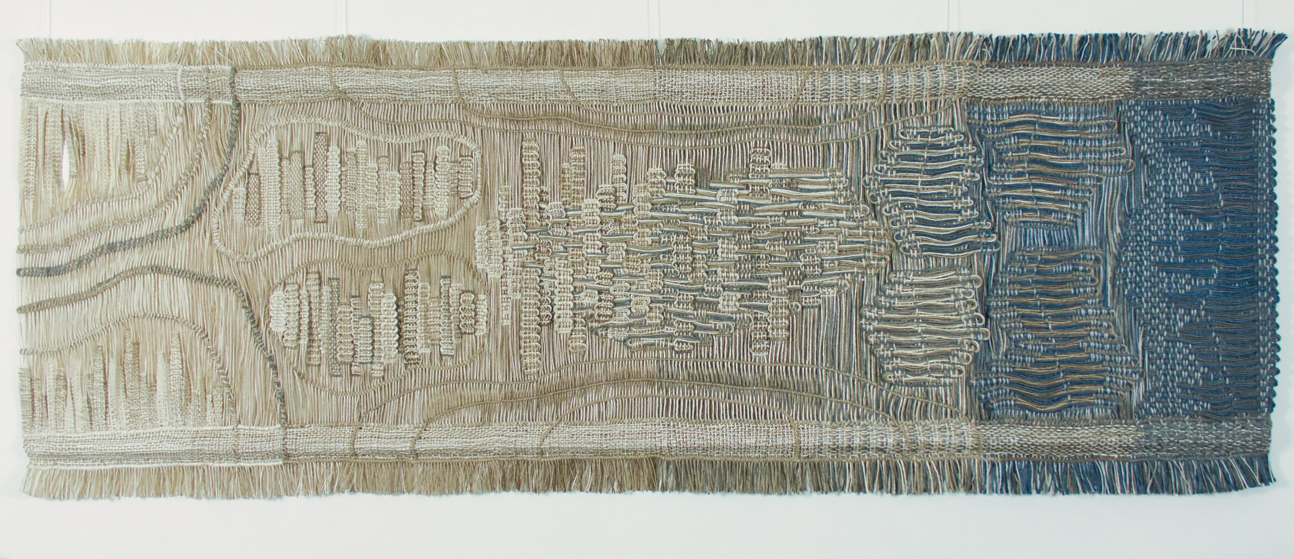 The piece is made on a 16 shafts, and uses a floats, fringes and plain and twill weave in the surface.